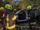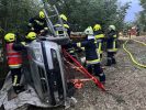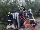 Ein PKW war in einem abgelegenen Waldstück verunfallt und lag quer. Eine Person war im Fahrzeug eingeklemmt. Zusätzlich kam es durch auslaufende Betriebsmittel zu mehreren kleinen Bränden, die sich rasch ausbreiteten.